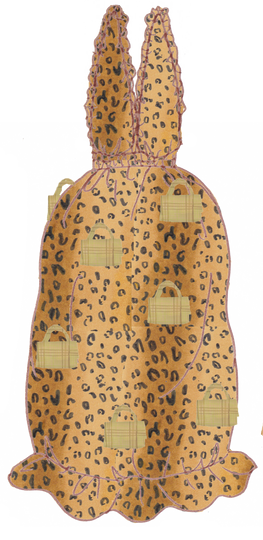 Une accumulation de clichés et une accumulation de matières, de couleurs, de motifs, pour jouer avec les normes d’une certaine forme de féminité : la bimbo girly, sorte de Barbie de la vraie vie, très fille, très femme, très « féminine ».
